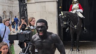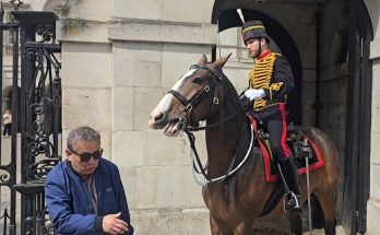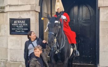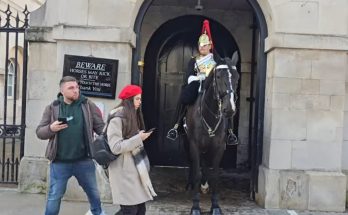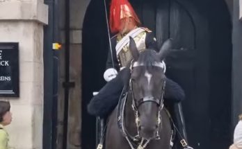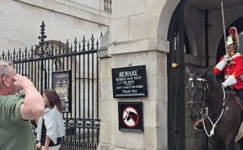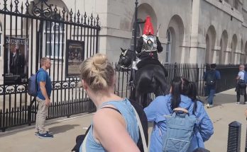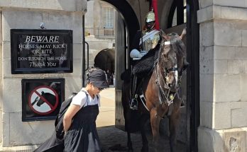 CHINESE TOURIST TRYS TO GET HER WATER BOTTLE BACK KINGS GUARD SHOUTS A tourist reaches in to retrieve her dropped water bottle, but the King’s Guard immediately shouts a warning, …