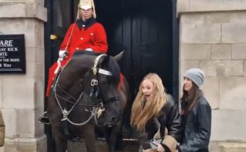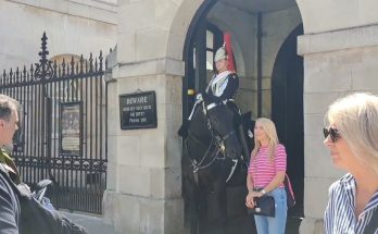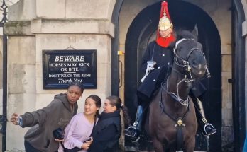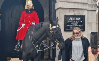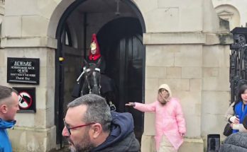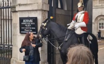 Royal guard horse tries to take her coat off! The royal guard horse suddenly reached out with its nose, gently tugging at her coat as if trying to take it …